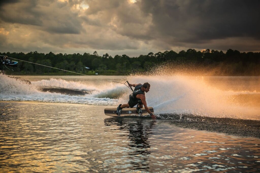 ウェイクサーフィンは、ボートの後ろにできる引き波に乗って楽しむマリンスポーツです。