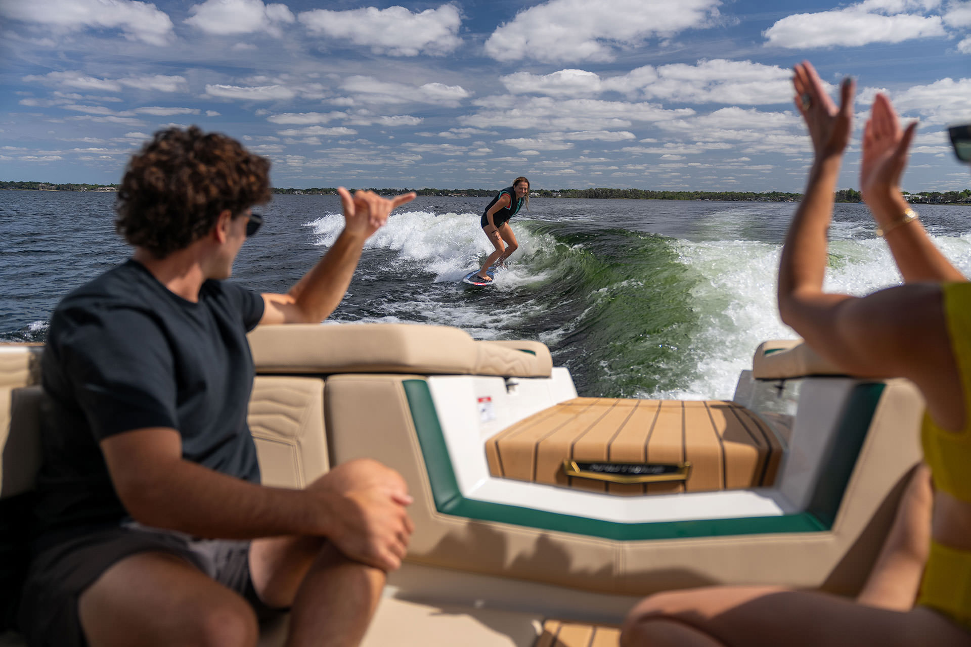 ウェイクサーフィンをしている女性をボートから見守る男女3人
